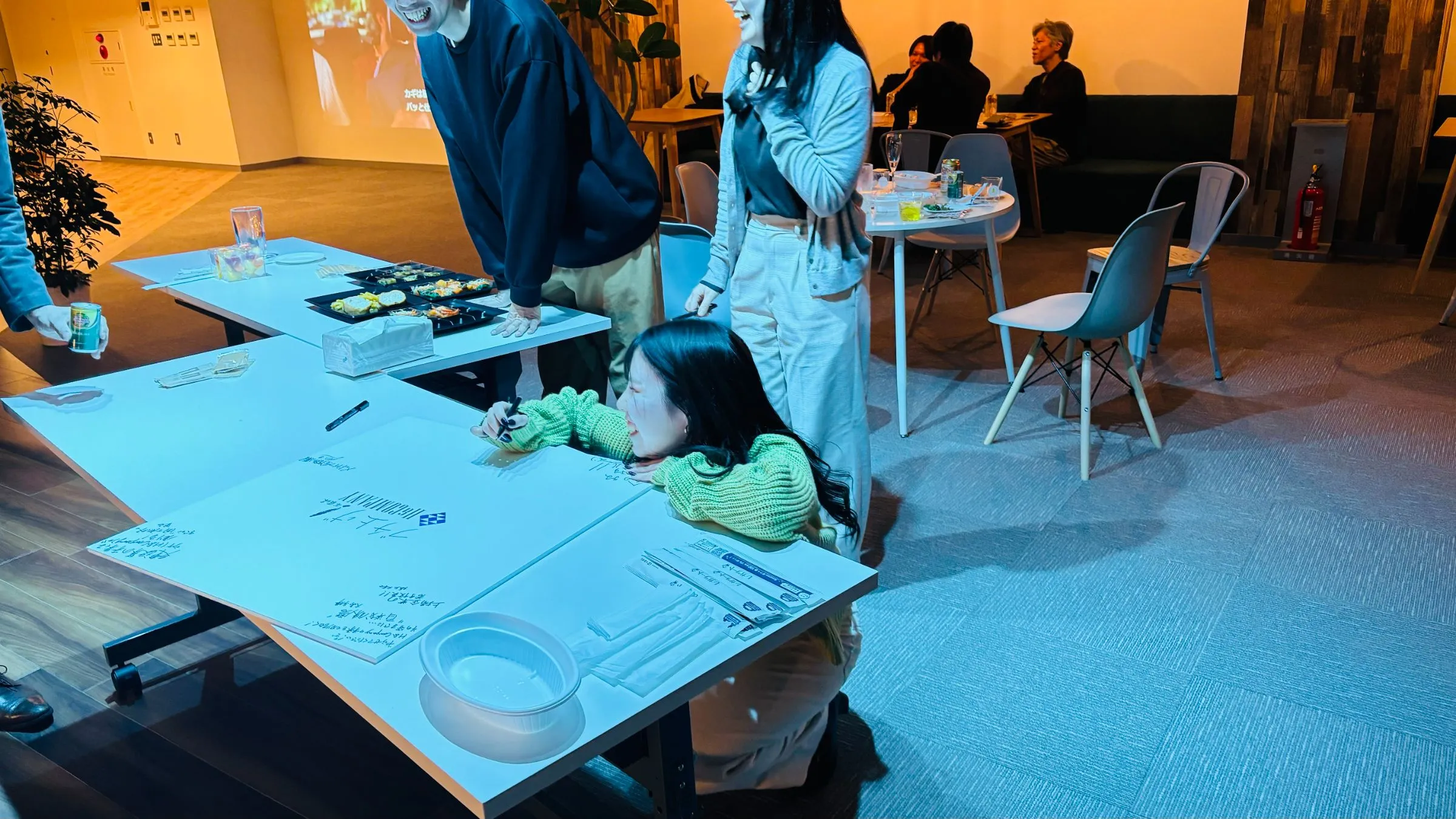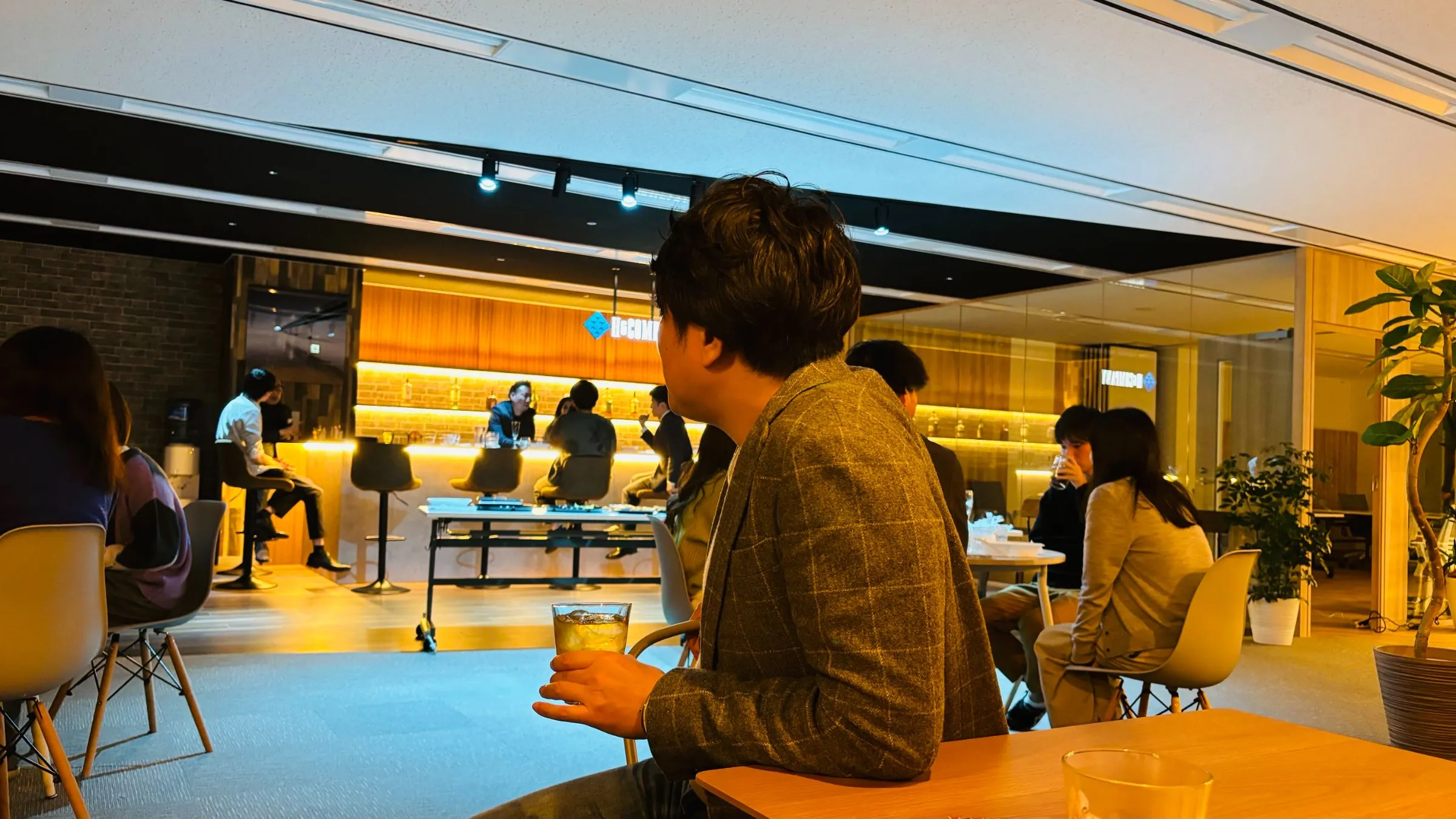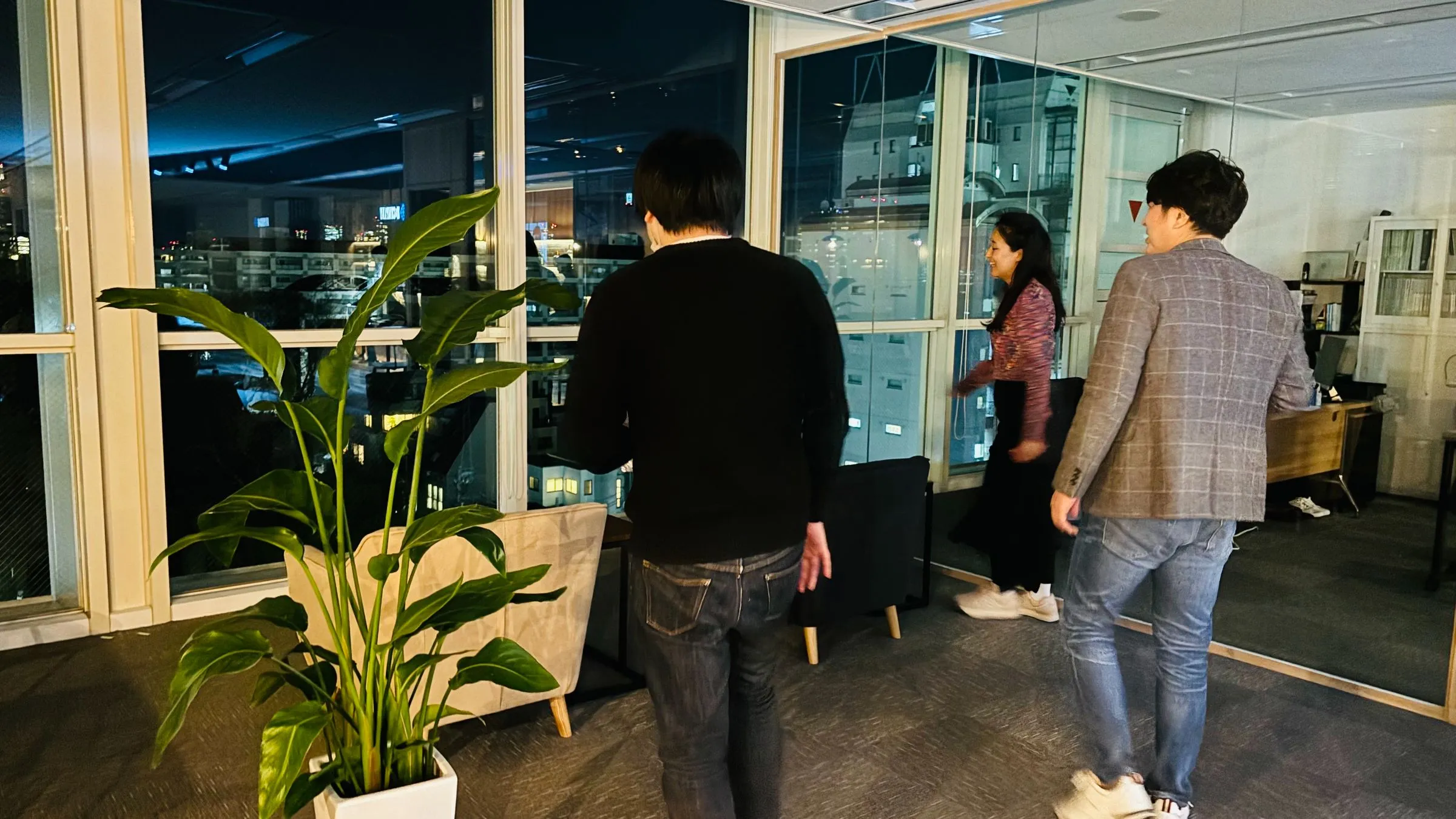 団らんを楽しむ社員と、増床したオフィスを見て、