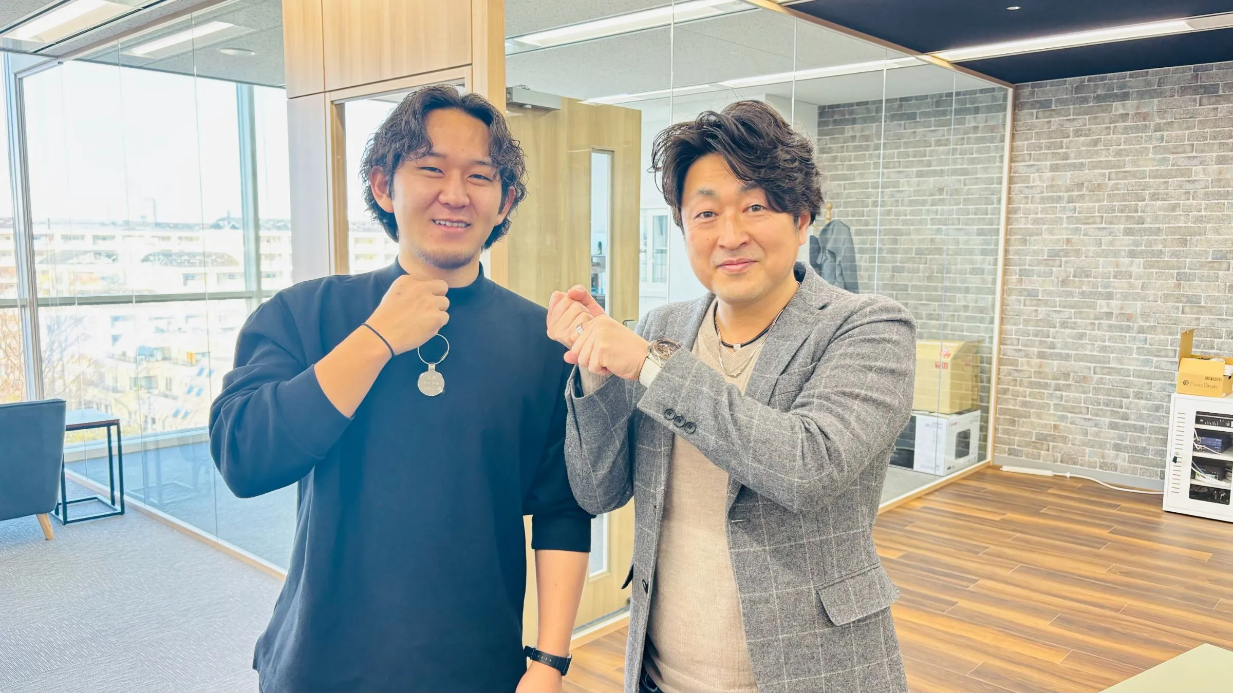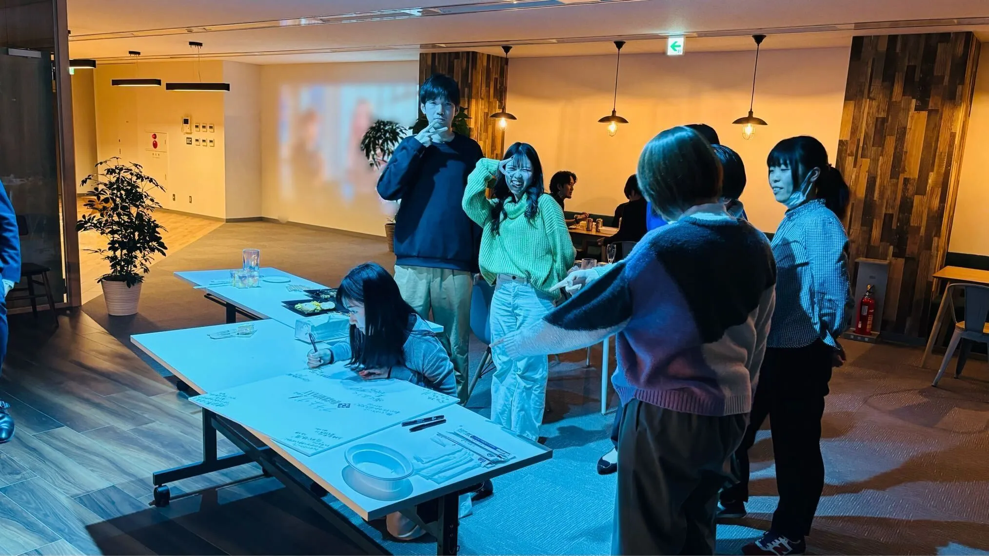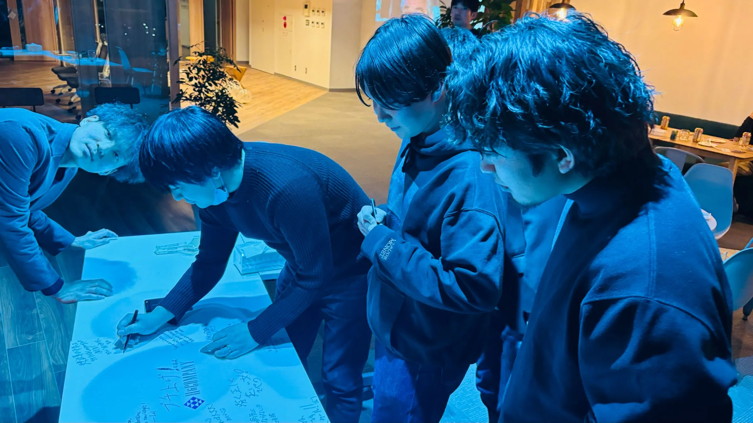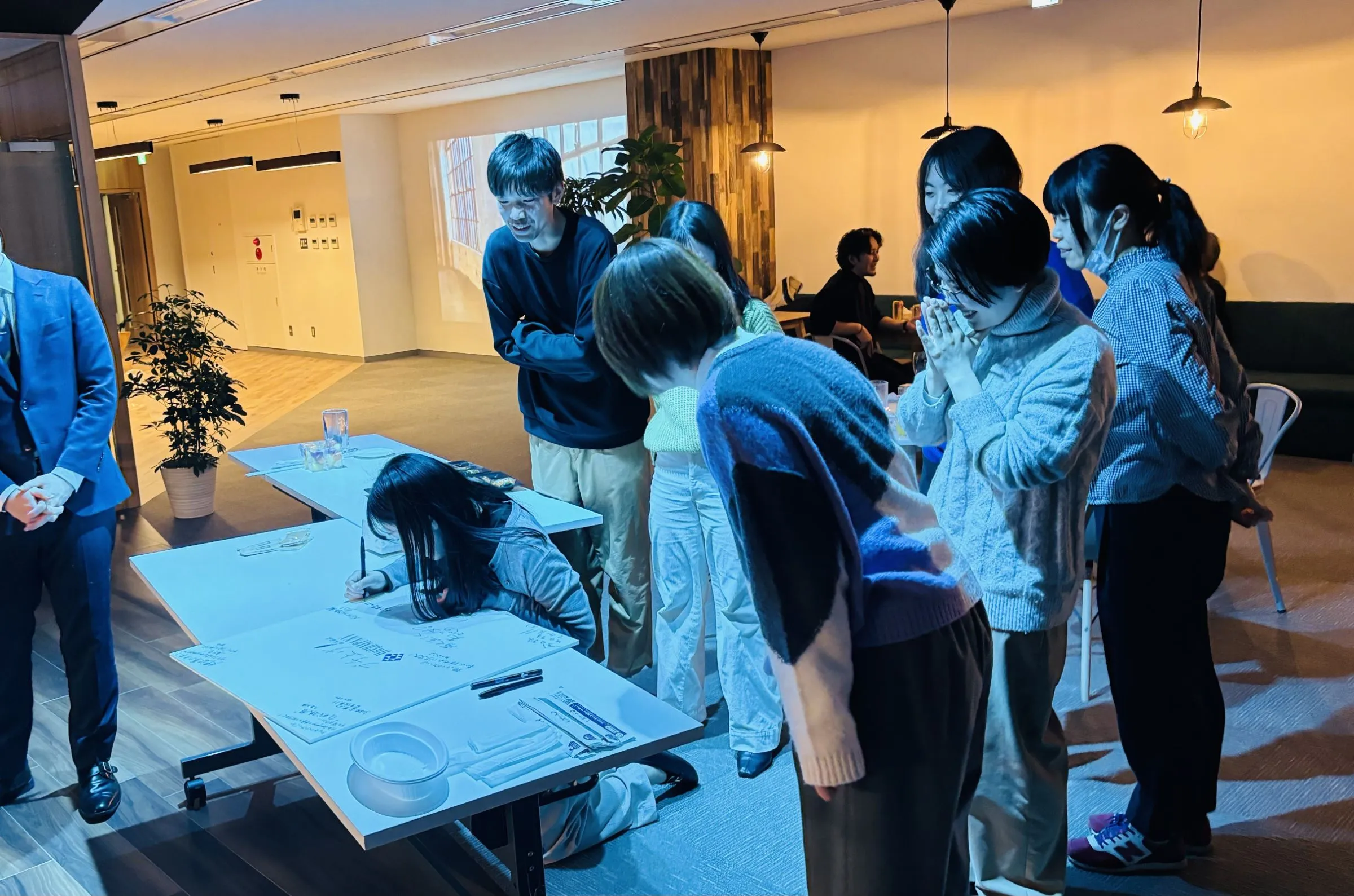 団らんを楽しむ社員と、増床したオフィスを見て、